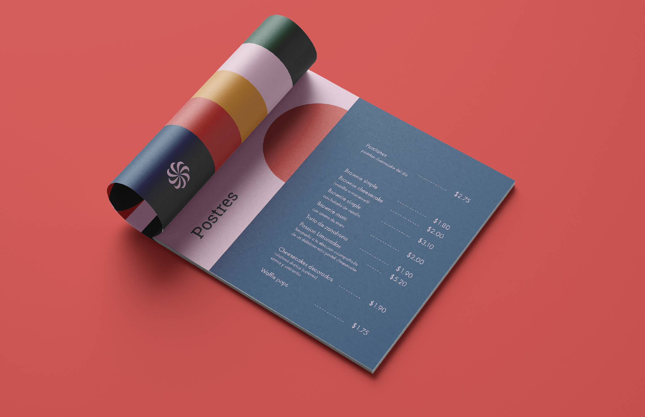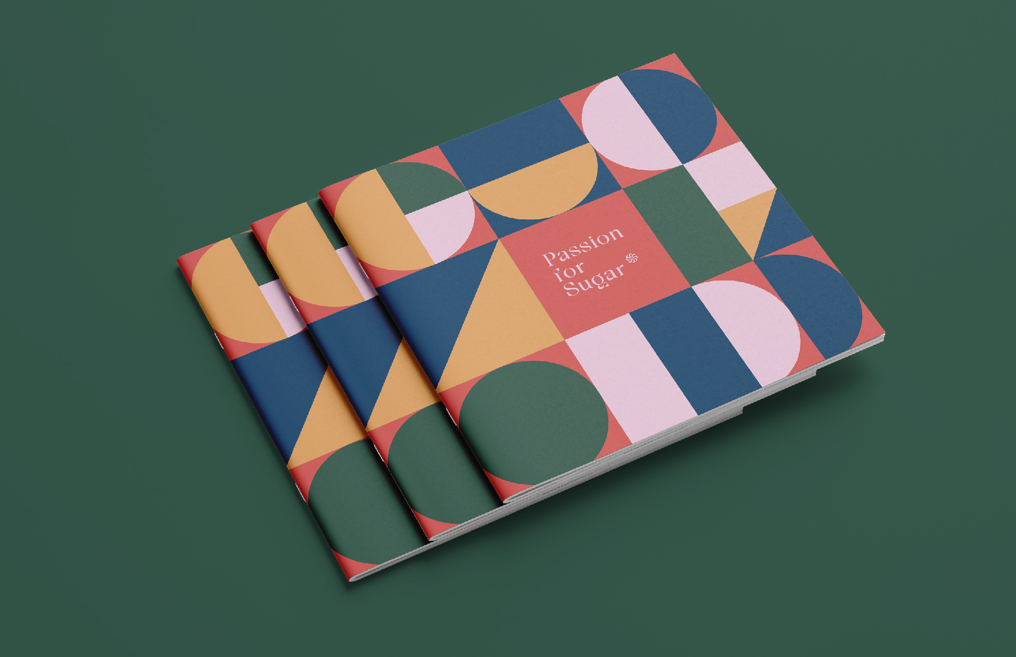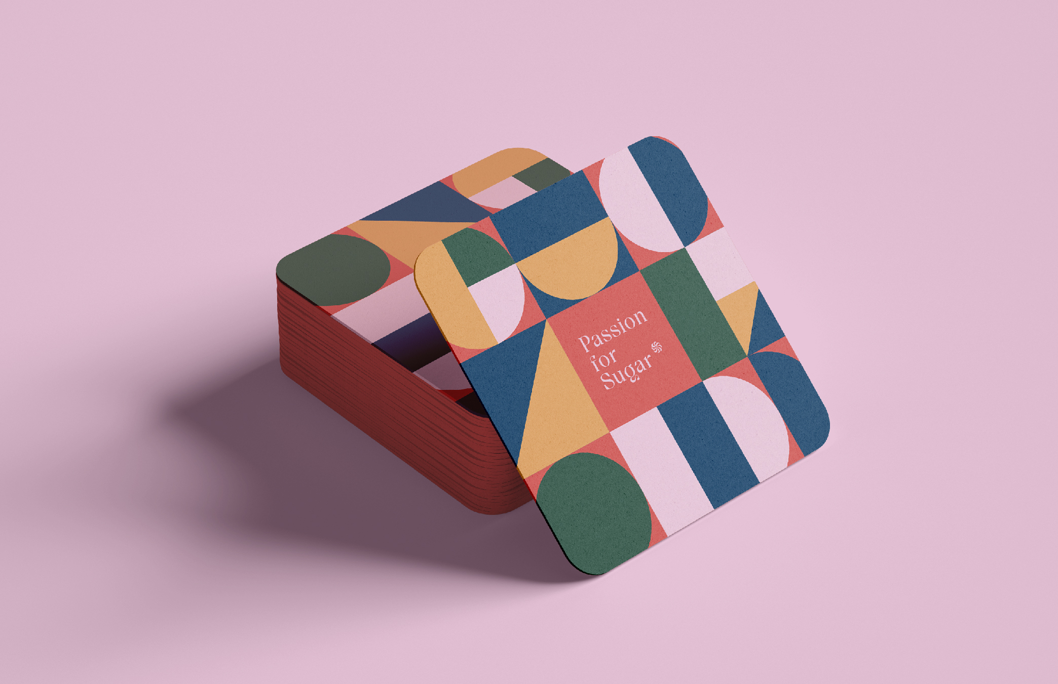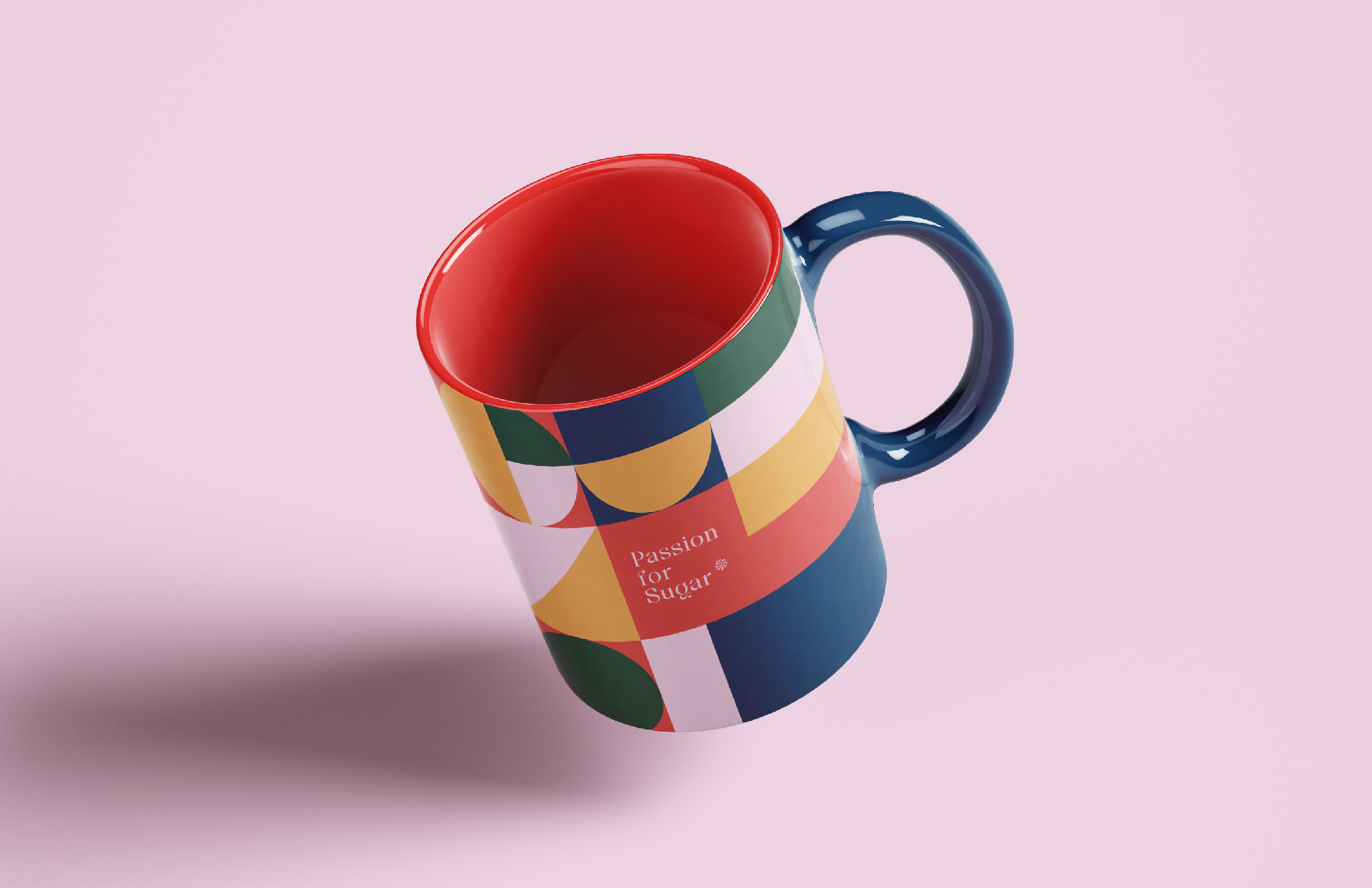 Rebranding for the dessert coffee shop Passion for Sugar. We wanted to play with strong colors and a basic geometry to have a playful tone that represents the joy that a bit of sugar can give to our day.